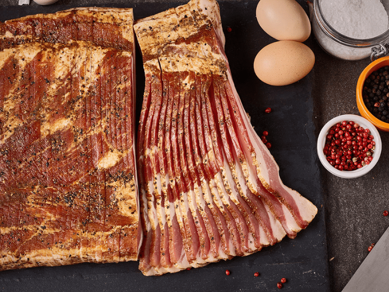 You’re getting approximately 5 lbs of our uncured, hardwood-smoked bacon in one big, beautiful sliced slab. No nitrates or nitrites added (except those naturally occurring in sea salt and celery powder), no fake stuff, and a solid 6g of protein per slice.